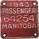 1942–44 | Embossed black serial on silver plate with border line; "MANITOBA 42" at bottom | 12-345 | 1 to approximately 84-000 | Revalidated for 1943 with red tabs (below), and for 1944 with windshield stickers, due to metal conservation for World War II.![]() |