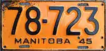 1945 | Embossed black serial on orange plate with border line; "MANITOBA 45" at bottom | 12-345 | 1 to approximately 84-500 | |