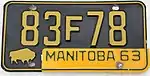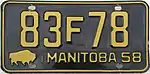 1958–63 | Embossed yellow serial on black plate with border line; "MANITOBA 58" at bottom, offset to right, with embossed bison graphic to left | none | 1A234 | 1A1 to 9Y999 |