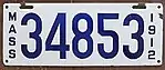 1912 | Blue serial on white porcelain plate; vertical "MASS" and "1912" at left and right respectively | 12345 | 1 to approximately 41000 | |