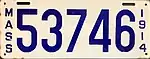 1914 | Blue serial on white porcelain plate; vertical "MASS" and "1914" at left and right respectively | 12345 | 1 to approximately 62000 | |