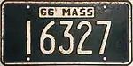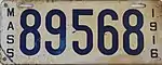 1916 | Dark blue serial on cream flat metal plate; vertical "MASS" and "1916" at left and right respectively | 123456 | 1 to approximately 102000 | |
