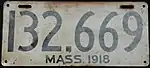 1918 | Dark blue serial on cream flat metal plate; "MASS. 1918" centered at bottom | 123,456 | 1 to approximately 142,000 | |