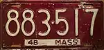 1948 | Embossed white serial on maroon plate; "48 MASS" within embossed white bar centered at bottom | 123·456 | 1 to approximately 948·000 | |