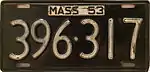 1951–52 | Embossed white serial on maroon plate; "MASS 51" within embossed white bar centered at bottom | 123·456 | 1 to 999·999 | Revalidated for 1952 with windshield sticker. |
