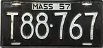 1957–58 | Embossed white serial on black plate with border line; "MASS 57" within embossed white bar centered at top | 123·456 | 1 to 999·999 | First 6" x 12" plate. Revalidated for 1958 with windshield sticker. |