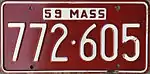 1959–60 | Embossed white serial on maroon plate with border line; "59 MASS" within embossed white bar centered at top | 123·456 A12·345 |