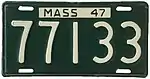1947 | Embossed white serial on dark green plate; "MASS 47" within embossed white bar centered at top | 123·456 | 1 to approximately 897·000 | |