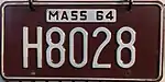 1964–65 | Embossed white serial on maroon plate with border line; "MASS 64" within embossed white bar centered at top | 123·456 A12·345 |