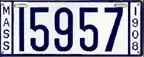 1908 | Blue serial on white porcelain plate; vertical "MASS" and "1908" at left and right respectively | 12345 | 1 to approximately 17500 | First dated plate. |