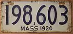 1920 | Embossed dark blue serial on white plate; "MASS. 1920" centered at bottom | 123,456 | 1 to approximately 219,000 | First embossed plate. |