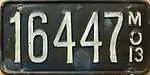 1913 | Embossed white serial on dark blue plate; "MO 13" at right | 12345 | 1 to approximately 36000 | |