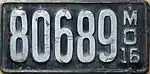 1916 | Embossed white serial on black plate; "MO 16" at right | 123456 | 1 to approximately 103000 | |