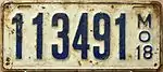 1918 | Embossed blue serial on white plate; "MO 18" at right | 123456 | 1 to approximately 185000 | |