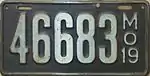 1919 | Embossed white serial on dark blue plate with border line; "MO 19" at right | 123456 | 1 to approximately 243000 | |