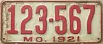 1921 | Embossed red serial on white plate with border line; "MO. 1921" centered at bottom | 123-456 | 1 to approximately 350-000 | |