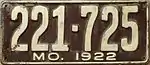 1922 | Embossed white serial on brown plate with border line; "MO. 1922" centered at bottom | 123-456 | 1 to approximately 355-000 | |