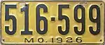 1926 | Embossed black serial on yellow plate with border line; "MO. 1926" centered at bottom | 123-456 | 1 to approximately 595-000 | |