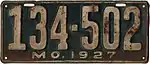 1927 | Embossed white serial on dark blue plate with border line; "MO. 1927" centered at bottom | 123-456 | 1 to approximately 606-000 | |