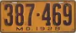 1928 | Embossed purple serial on orange plate with border line; "MO. 1928" centered at bottom | 123-456 | 1 to approximately 631-000 | |