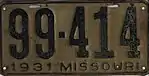 1931 | Embossed black serial on gray plate with border line; "1931 MISSOURI" at bottom | 123-456 | 1 to approximately 659-000 | |