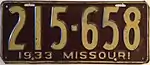 1933 | Embossed beige serial on brown plate with border line; "1933 MISSOURI" at bottom | 123-456 | 1 to approximately 598-000 | |