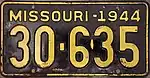 1944 | Embossed yellow serial on black plate with border line; "MISSOURI-1944" at top | 123-456 | 1 to approximately 696-000 | |