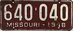 1948 | Embossed white serial on maroon plate with border line; "MISSOURI-1948" at bottom | 123-456 | 1 to approximately 871-000 |