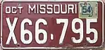 1962–66 | Embossed white serial on maroon plate with border line; "MISSOURI" centered at top; month of expiration at top left and white box at top right containing debossed "62" | AB1-234 | First letter corresponds to month of expiration | Valid without stickers in 1962, then revalidated with stickers each year thereafter. |