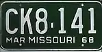 1967 | Embossed white serial on green plate with border line; month of expiration, "MISSOURI" and "68" at bottom | none | AB1-234 | First letter corresponds to month of expiration | |