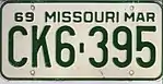 1968 | Embossed green serial on white plate with border line; "69", "MISSOURI" and month of expiration at top | none | AB1-234 | First letter corresponds to month of expiration | |