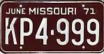 1970 | Embossed white serial on maroon plate with border line; month of expiration, "MISSOURI" and "71" at top | none | AB1-234 | First letter corresponds to month of expiration | |