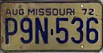 1971 | Embossed blue serial on reflective white plate with border line; month of expiration, "MISSOURI" and "72" at top | none | A1B-234 | First letter corresponds to month of expiration | |
