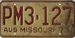 1938 | Embossed black serial on buff plate with border line; "19 MISSOURI 38" at bottom | 123-456 | 1 to approximately 715-000 | |