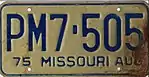 1975 | Embossed reflective (glass-beaded) yellow serial on blue plate with border line; month of expiration, "MISSOURI" and "76" at top | none | A1B-234 | First letter corresponds to month of expiration | |
