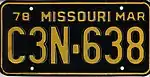 1977 | Embossed reflective (glass-beaded) yellow serial on black plate with border line; "78", "MISSOURI" and month of expiration at top | none | A1B-234 | First letter corresponds to month of expiration | |