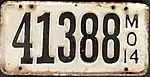 1914 | Embossed black serial on white plate; "MO 14" at right | 12345 | 1 to approximately 51000 | |