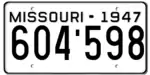 1947 | Embossed black serial on white plate with border line; "MISSOURI-1947" at top | 123-456 | 1 to approximately 828-000 | |