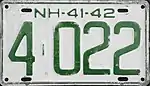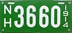 1918 | White serial on green porcelain plate; "N H" and "1918" centered at top and bottom respectively | none | 12345 | 100 to approximately 24700 | Some later plates manufactured on fiberboard.[2] |
