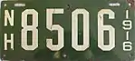 1916 | White serial on green porcelain plate; vertical "NH" and "1916" at left and right respectively | none | 12345 | 1 to approximately 17600 | |