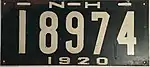 1920 | White serial on dark green flat metal plate; "N H" and "1920" centered at top and bottom respectively | none | 12345 | 100 to approximately 35000 | |