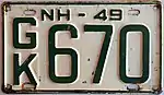 1949 | Embossed forest green serial on white plate with border line; "NH - 49" centered at top | none | A/B123 | County-coded | |