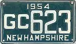 1954 | Embossed white serial on forest green plate with border line; "NEW HAMPSHIRE" at bottom; "1954" centered at top | none | AB123 | County-coded | First use of the full state name. |
