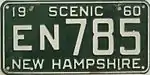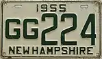 1955 | Embossed forest green serial on white plate with border line; "NEW HAMPSHIRE" at bottom; "1955" centered at top | none | AB123 | County-coded | |