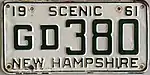 1957 | Embossed forest green serial on white plate with border line; "NEW HAMPSHIRE" at bottom; "19" at top left and "57" at top right | "SCENIC" centered at top | AB123 | County-coded | |
