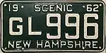 1958 | Embossed white serial on forest green plate with border line; "NEW HAMPSHIRE" at bottom; "19" at top left and "58" at top right | "SCENIC" centered at top | AB123 | County-coded | |