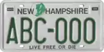 January 1999 – present | Embossed dark green serial on reflective graphic plate with Old Man of the Mountain and Cannon Mountain against pale blue sky; screened dark green "New HAMPSHIRE" centered at bottom, with cursive "New" above serifed "HAMPSHIRE" | "LIVE FREE OR DIE" screened in dark green centered at top | 12345 | 1 to 99999 | Old Man graphic at right (also the style for vanity plates). |