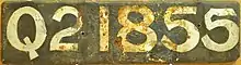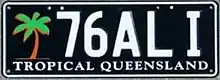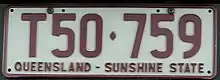 The Australian state of Queensland requires its residents to register their motor vehicles and display vehicle registration plates.[1] Current regular issue plates are to the standard Australian dimensions of 372 mm (14.6 in) in length by 134 mm (5.3 in) in height, and use standard Australian serial dies.[2]