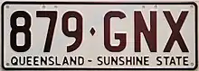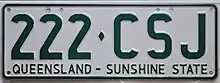 Once the aaa·nnn format between NAA·000 and PZZ·999 was exhausted, Queensland reversed the order to nnn·aaa, starting 1 July 1977.[3] These plates were issued with green text on a white reflective background and bore the slogan Queensland – Sunshine State.[3] As such Queensland became the second jurisdiction in Australia to issue sloganised plates.[3] This series started at 000·NAA and spanned through to 999·PZZ.[4] After exhausting this initial allocation, in late 1987, Queensland began issuing combinations from 000·AAA onwards.