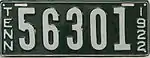 1918 | Embossed black serial on light green plate with border line; vertical "TENN" and "1918" at left and right respectively | 12345 | 6001 to approximately 69000 | |